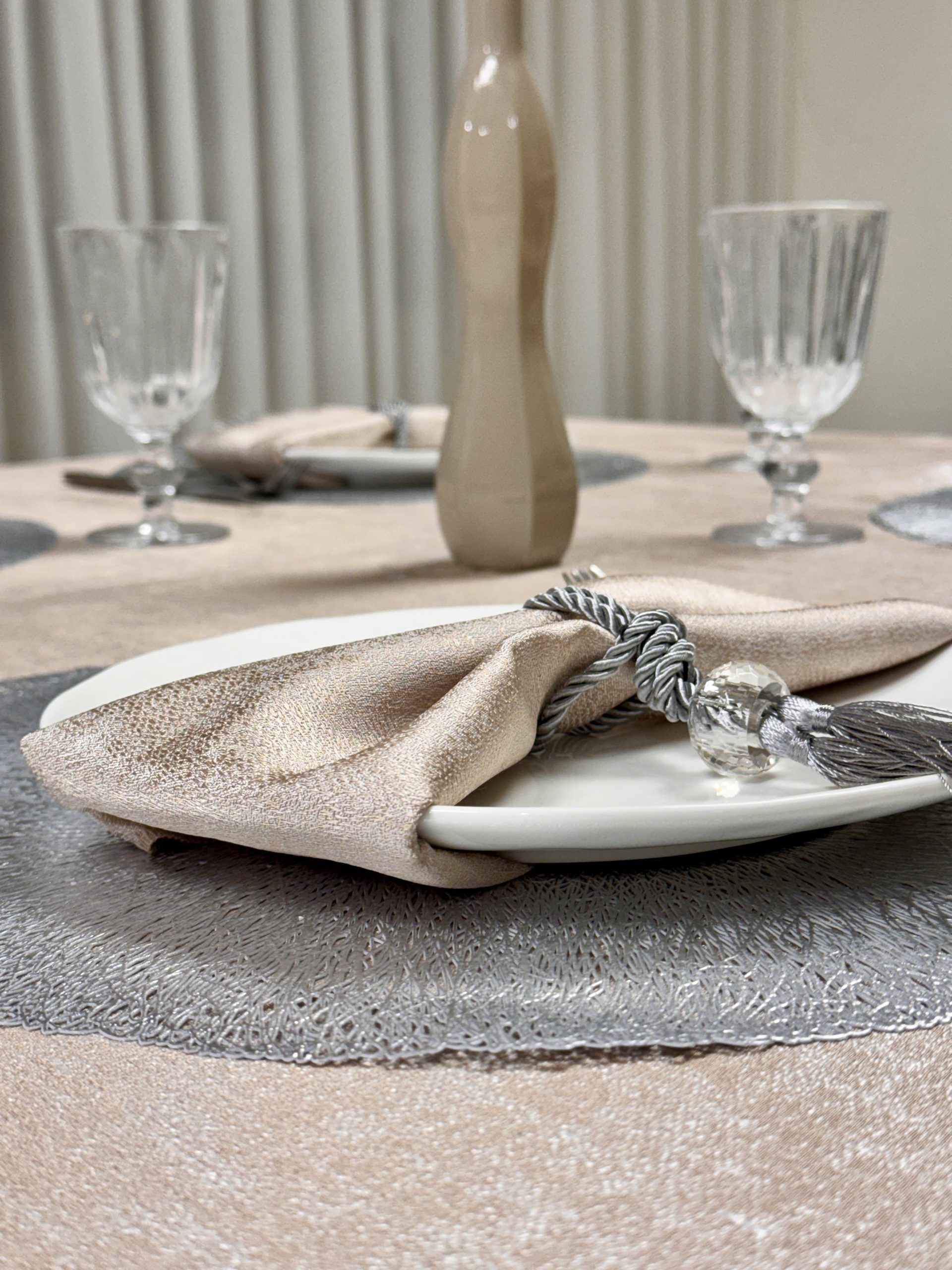 מפת שולחן יוקרתית בגוון מוקה רך עם ברק ורדרד מעודן, המשלבת בין סגנון מודרני לקלאסי. עשויה מבד איכותי ועמיד, קלה לניקוי ומשדרגת כל שולחן באירוח חגיגי