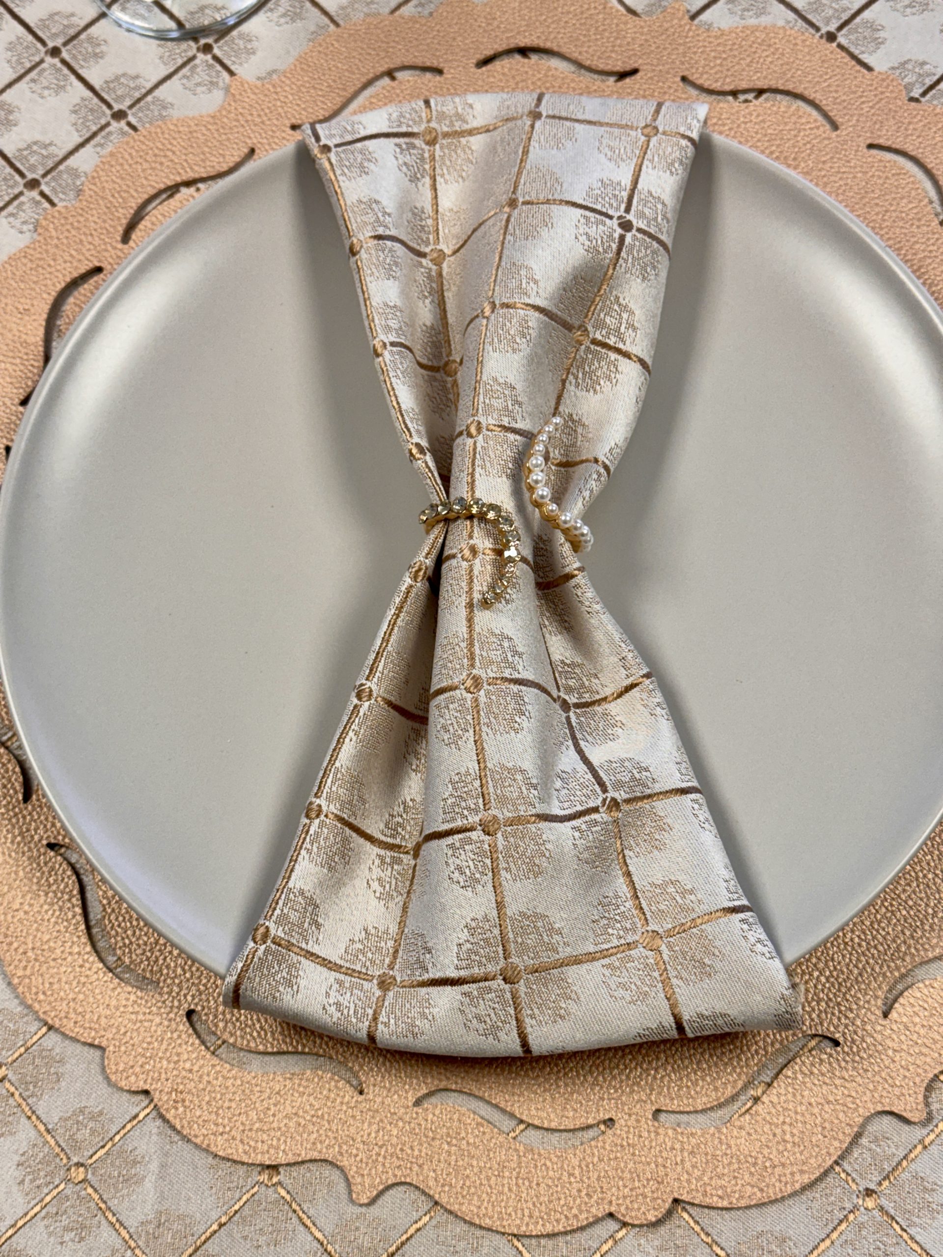 מפת יהלום יוקרתית בעיצוב מרשים עם דוגמת קווים עדינה בצורת יהלומים, המשדרת יוקרה ותחכום. הבד בעל ברק עדין שמעניק לשולחן מראה אלגנטי, ומתאים לכל אירוע חגיגי או ארוחת ערב מפוארת. שילוב מושלם של סגנון קלאסי עם טאץ’ מודרני.